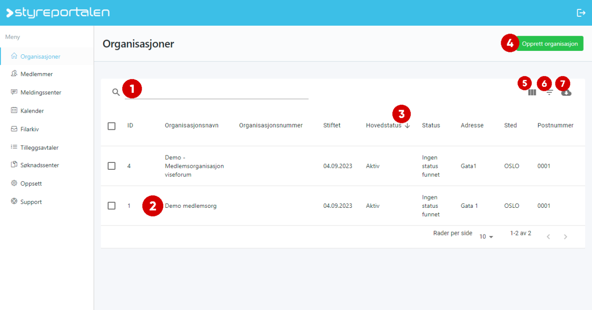 Her kan dere filtrere listen over organisasjoner etter bestemte verdier.