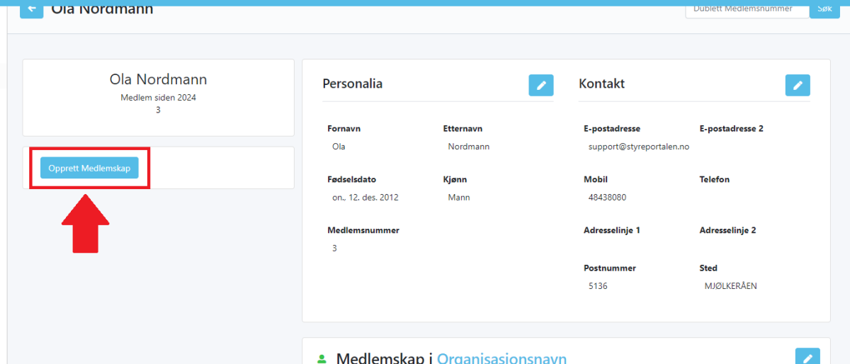 - Man får nå opp en visning av all info som er lagret på personen. Her kan du opprette et nytt medlemskap ved å trykke den blå knappen "Opprett Medlemskap".