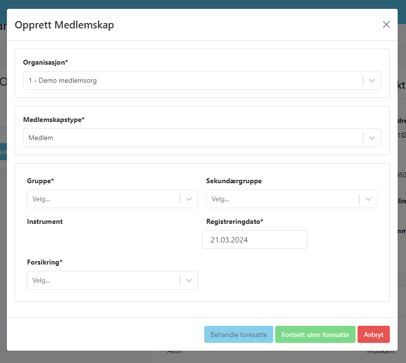 - "Behandle foresatte" - Gir deg muligheten til å legge inn info om personens foresatte i organisasjonen de får medlemskap i før du oppretter medlemskapet.