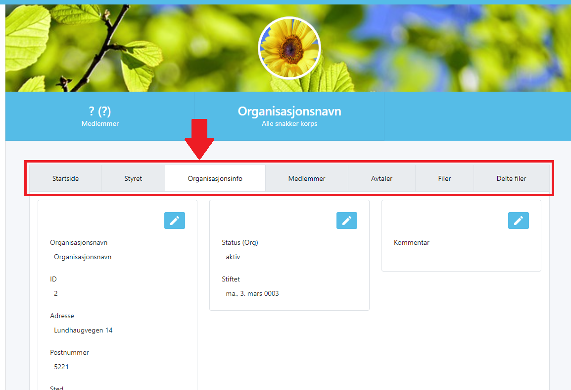 Når du har trykket inn i organisasjonen kan se forskjellig info om organisasjonen ved å trykke på de forskjellige fanene under organisasjonen: