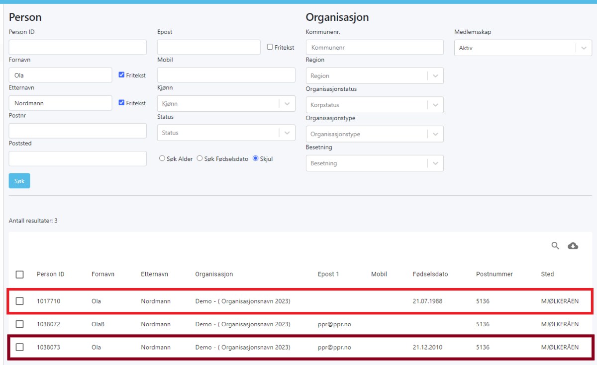 I eksemplet ønsker vi å beholde Ola Nordmann med medlemsnummer(person ID) 1038073 og fjerne den med medlemsnummer(person ID) 1017710.