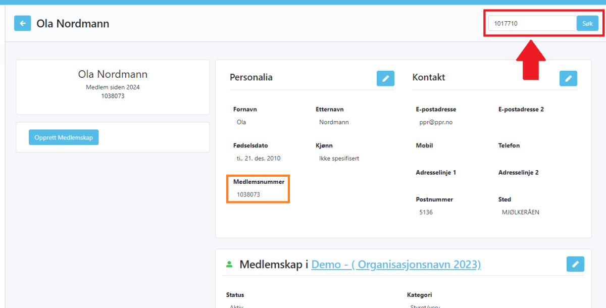- Trykk så på den blå knappen merket "Søk" til høyre for "Dublett Medlemsnummer"-feltet.